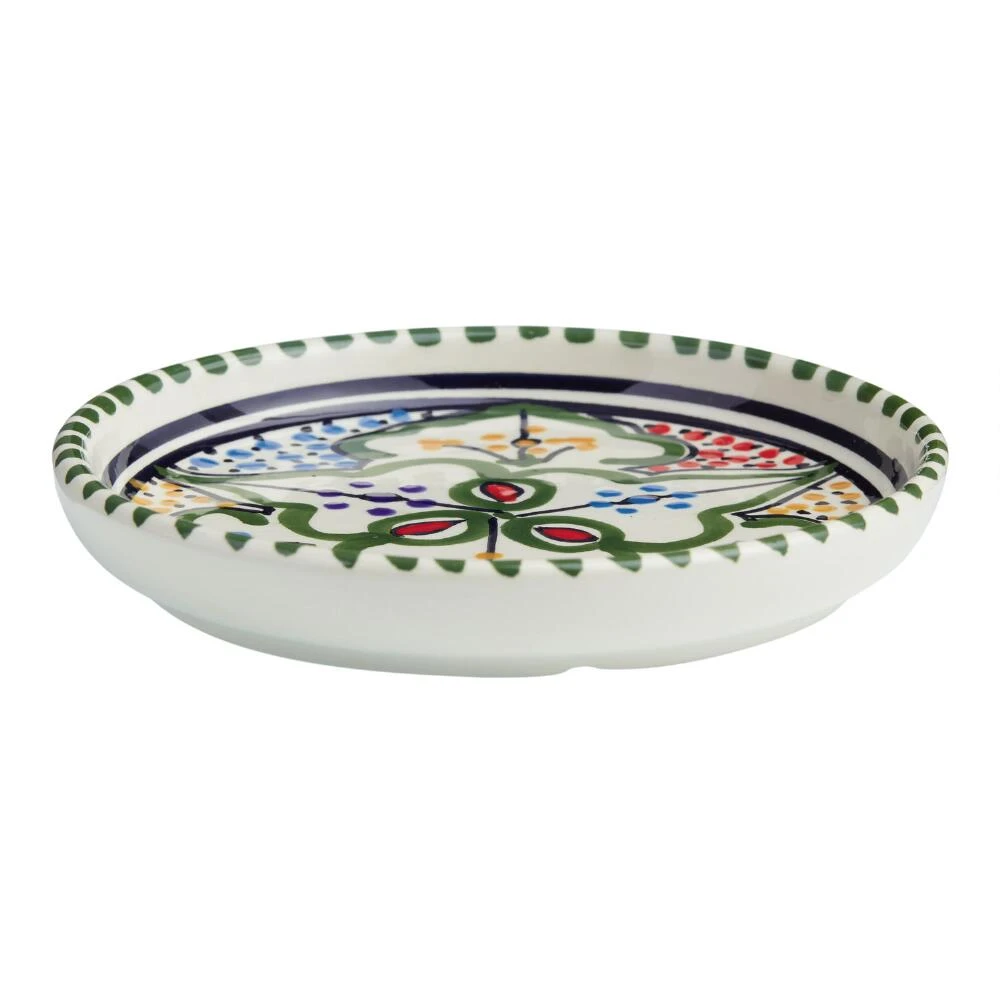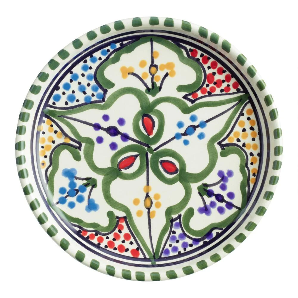 The Amira appetizer plate is hand-painted by Tunisian artisans with a traditional design in a vivid kaleidoscope of colors. A one-of-a-kind showcase of North African craftsmanship, this character-rich plate is designed with a rim to help hold sauces and dressings in.