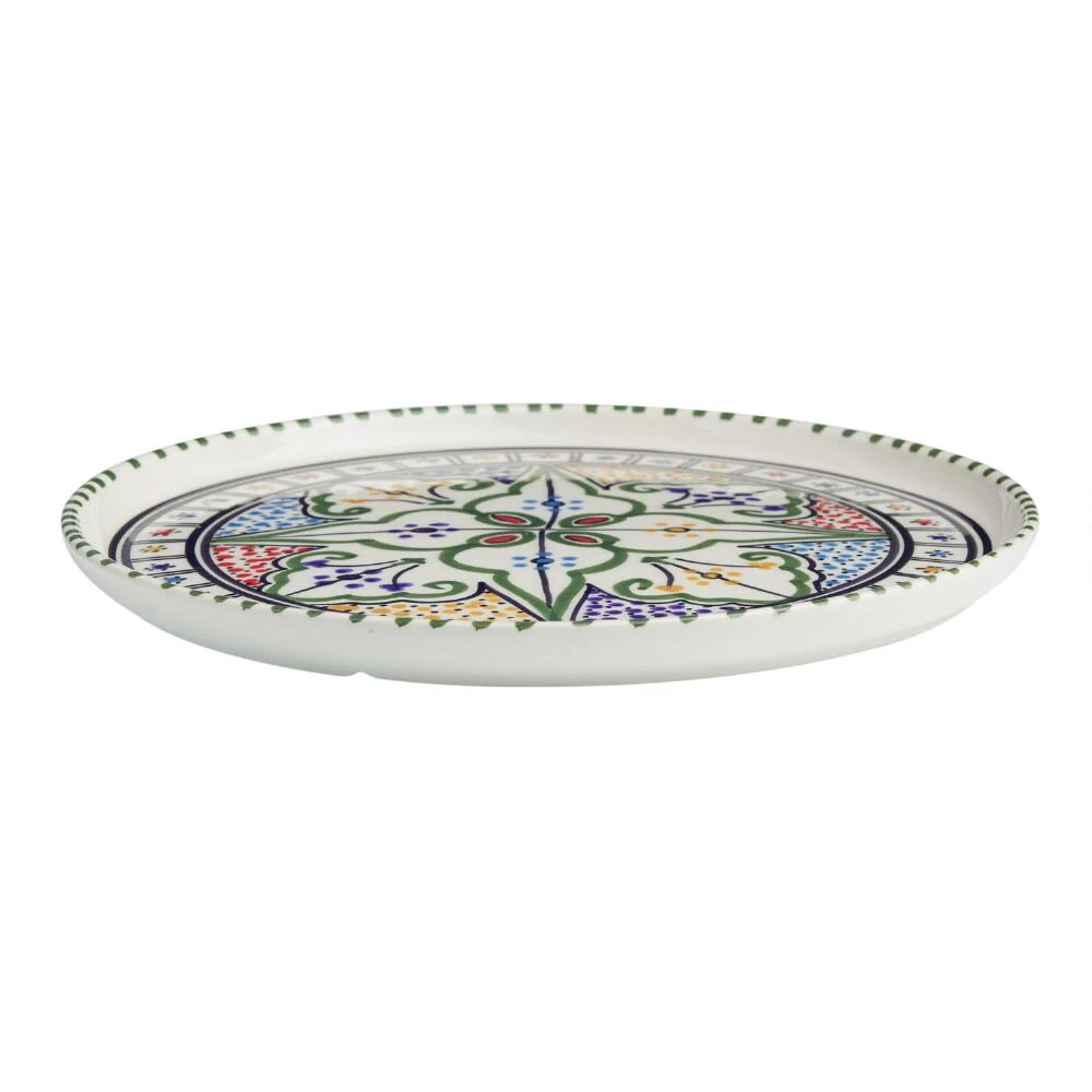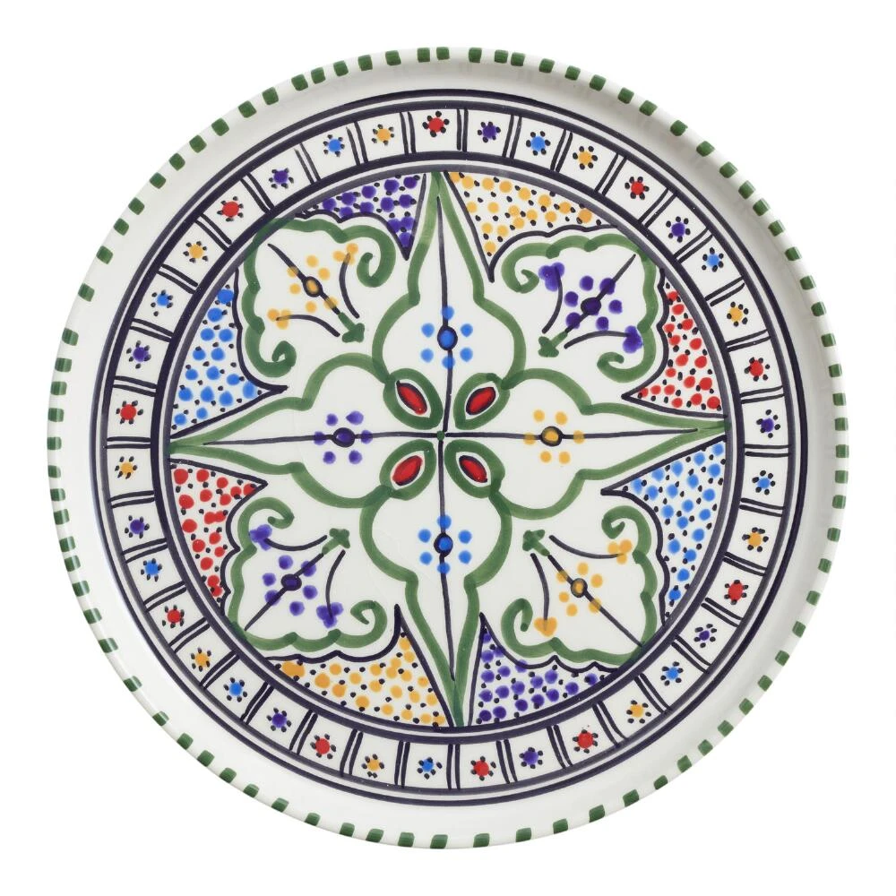 The Amira ceramic dinner plate is hand-painted by Tunisian artisans with a traditional design in a vivid kaleidoscope of colors. A one-of-a-kind showcase of North African craftsmanship, this character-rich plate is designed with a rim to help keep sauces and dressings from spilling.