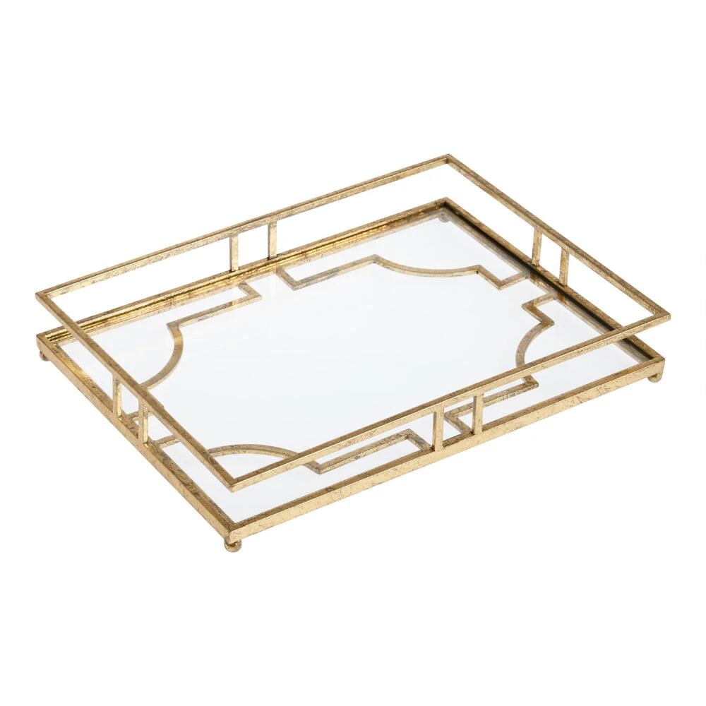 Serve up a touch of vintage style with this geometric glass bar tray featuring a hand painted antique-gold frame with a notched base. Pairing artistic lines with ample surface area, this art deco-inspired tray will add functional chic to your home bar service collection.