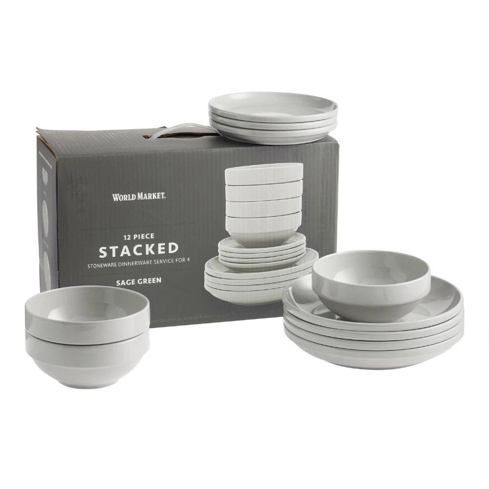 Nesting neatly in a stack to save space and streamline your cupboards, our glazed place settings are a timeless choice for everyday meals or entertaining. Made of ceramic with a lip to contain dishes with sauce or dressing, our stacked dinner plates, salad plates and bowls set a fresh, minimalistic table for up to four people. Choose from off-white, sage green and a soft dove gray to best suit your dining room aesthetic.