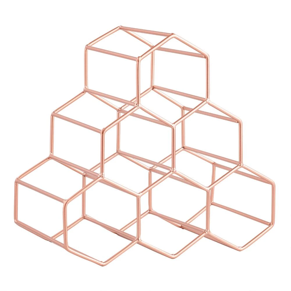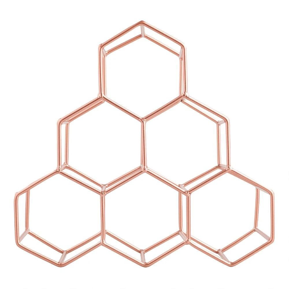 Our perfectly proportioned hexagonal wine rack looks good from any angle. It’s made of metal wire with a warm copper finish and is designed to cradle six standard-size bottles of wine atop a kitchen island, home bar or sideboard.