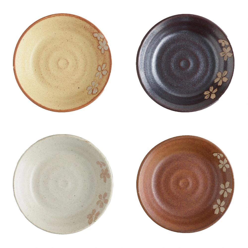 Set an elegant, tranquil table with our rustic dip bowl inspired by traditional Japanese design. Made of stoneware and organically textured, the set includes dishes in four earthy colors, each adorned with a delicate cherry-blossom motif. Mix with your current place settings or match with other pieces from the collection for elevated entertaining and everyday dining.