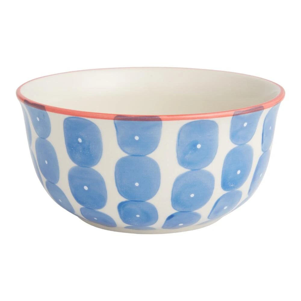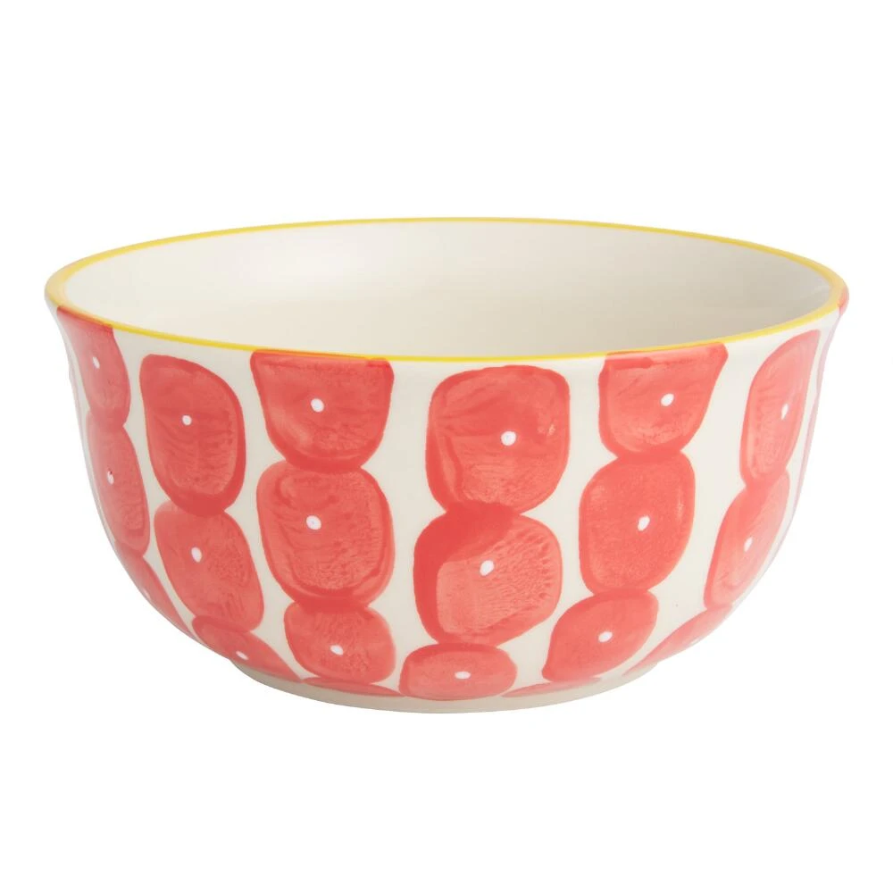 Make a modern statement on your dining table with this stoneware noodle bowl, hand-painted with a bold geometric design and colorful contrasting rim. Available in red-orange, yellow and blue, each bowl is artfully adorned with wavy stripes and dots. This kitchen staple is perfect for large portions of ramen, stir-fries, salads and more. Pick up a few in coordinating colors or mix and match for a unique dinnerware display.