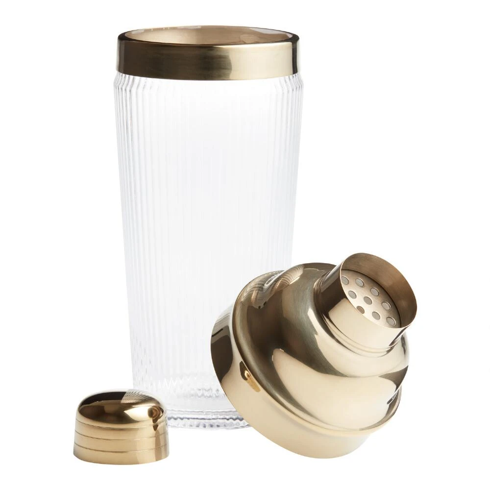 With a metallic-gold stainless steel lid for that just-right touch of luxe, this cocktail shaker is made of glass with a subtle ribbed texture for added sophistication. A vintage-inspired classic, our shaker with an included strainer is a refined addition to your home bar.