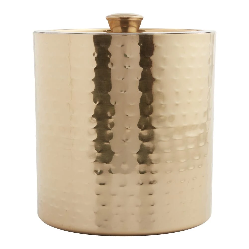 Keep your ice within reach with this exclusive double-walled bucket with a luxe hammered-gold finish that blends practical design with artful sophistication. It fits easily on any bar cart or tabletop and comes complete with matching metal tongs and a snug lid to preserve your ice for the next drink. The satin finished interior makes it a snap to clean and wipe dry.