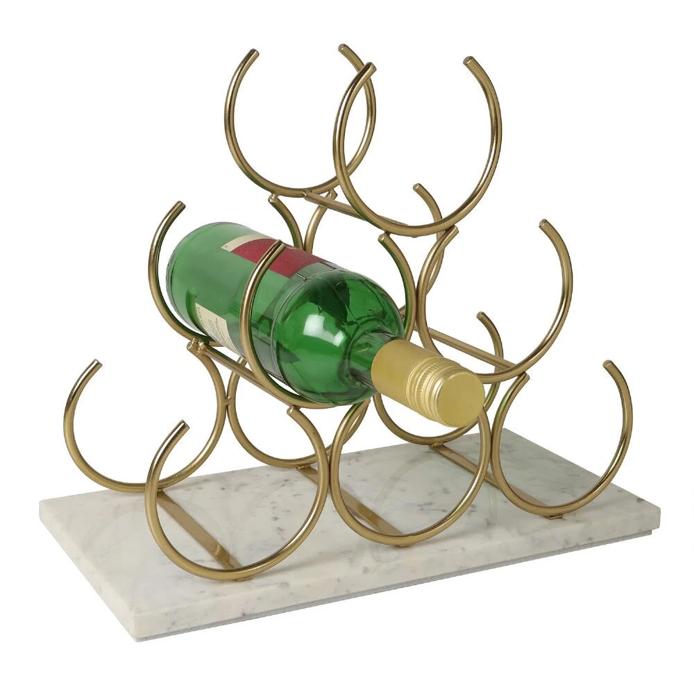 Give your selection of fine wines pride of place on your sideboard in this elegant rack made of marble and iron with a gold finish. The stone slab supports a graceful pyramid formation of sculpted metal cradles that hold six standard wine bottles.