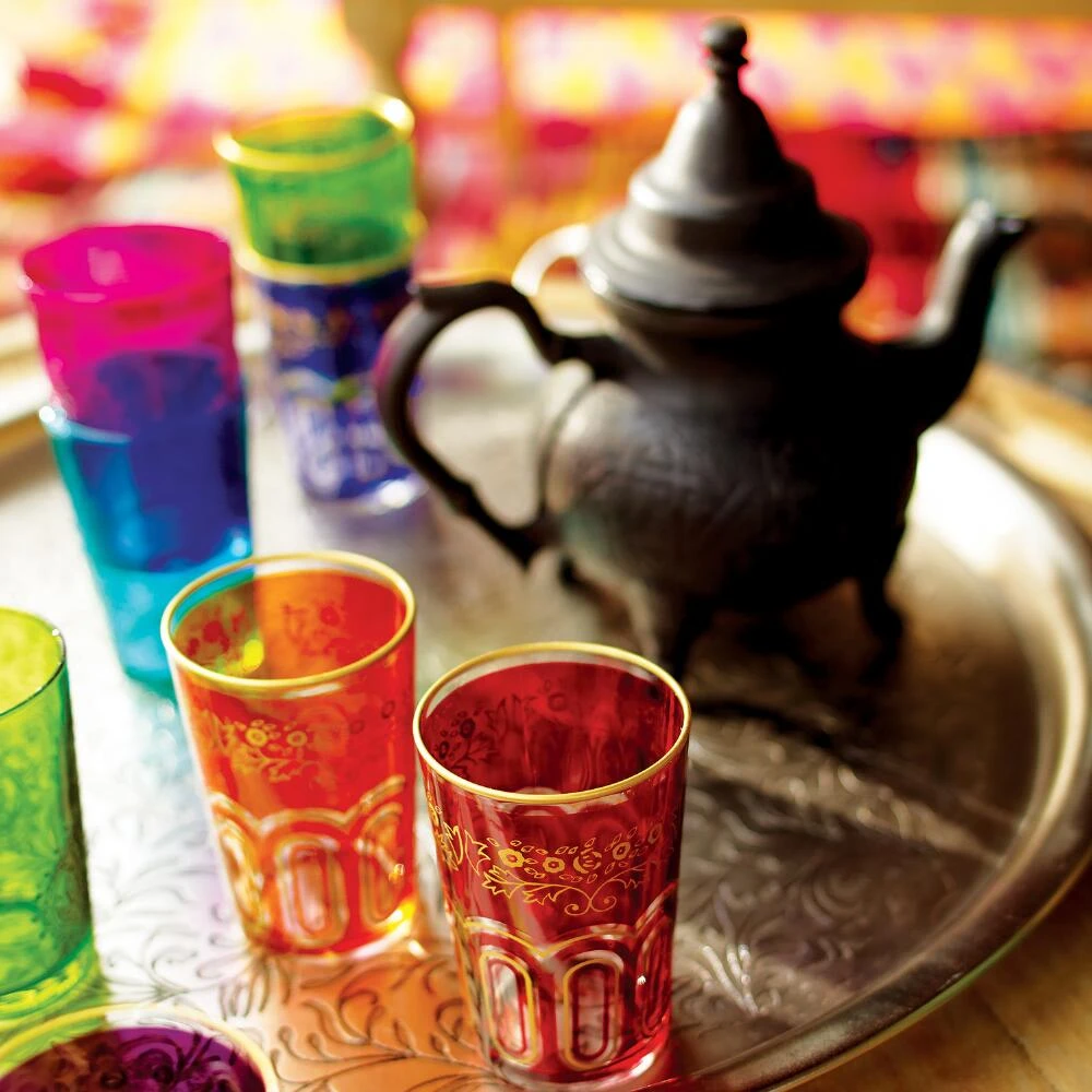 We traveled to Morocco to find these beautiful tea glasses, which take their cue from authentic Moroccan designs. In six vibrant hues decorated by hand with intricate gold embellishments, these drinking glass bring North African-inspired style to your home bar.