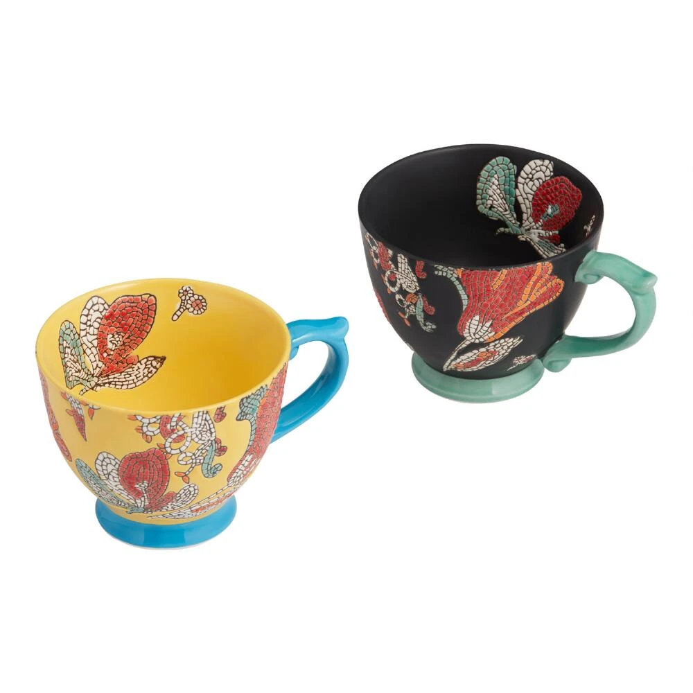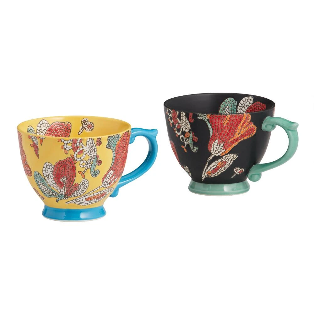 Intricately hand painted, our set of two mugs resembles magnificent floral mosaics. Mixing matte and shiny glazes, this complementary yet distinctive pair features black, white, yellow, blue, pink and turquoise hues. The pattern flows into the interior for artistic appeal from the first sip to the last.