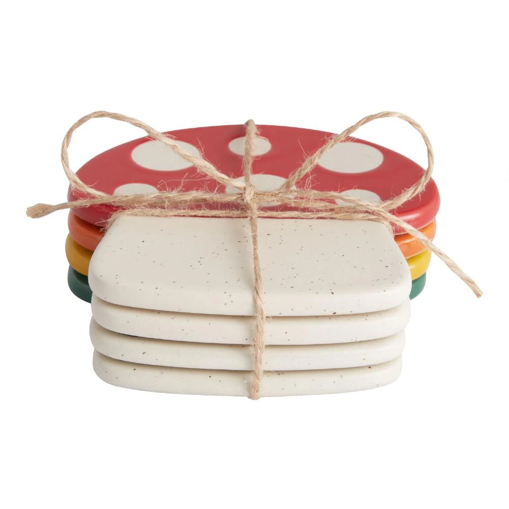 Set your drink down in retro style with these colorful mushroom-shaped stoneware coasters in red, orange, ochre yellow, and green with a speckled finish. These set of four will brighten up any coffee table or sideboard and are perfect for hot and cold beverages alike.
