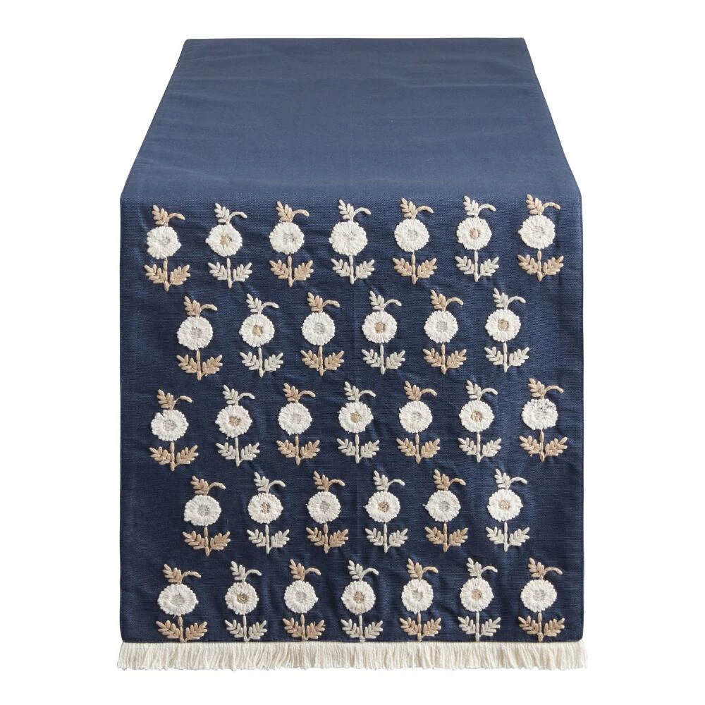 Our exclusive table runner is embroidered with rows of petite white flowers on a navy ground. A simple way to transform your table setting, this charming runner adds color and pattern to everyday meals and festive gatherings.