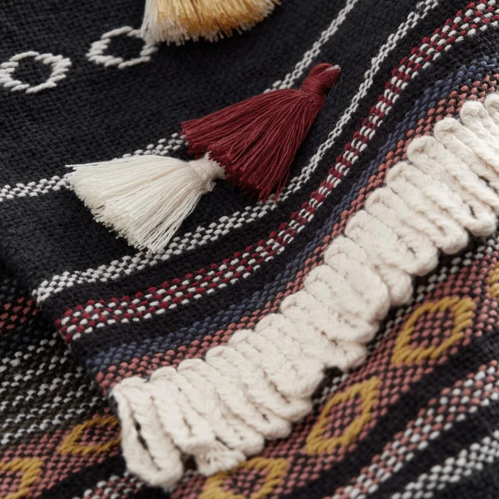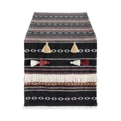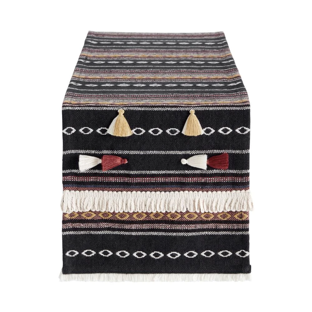 Bring texture and color to your table setting with our navy-blue table runner. A chic refresh for your table linen collection, this richly colored runner is woven with a striped pattern featuring warm pops of yellow, burgundy and rust brown and accented with fringe tassels.