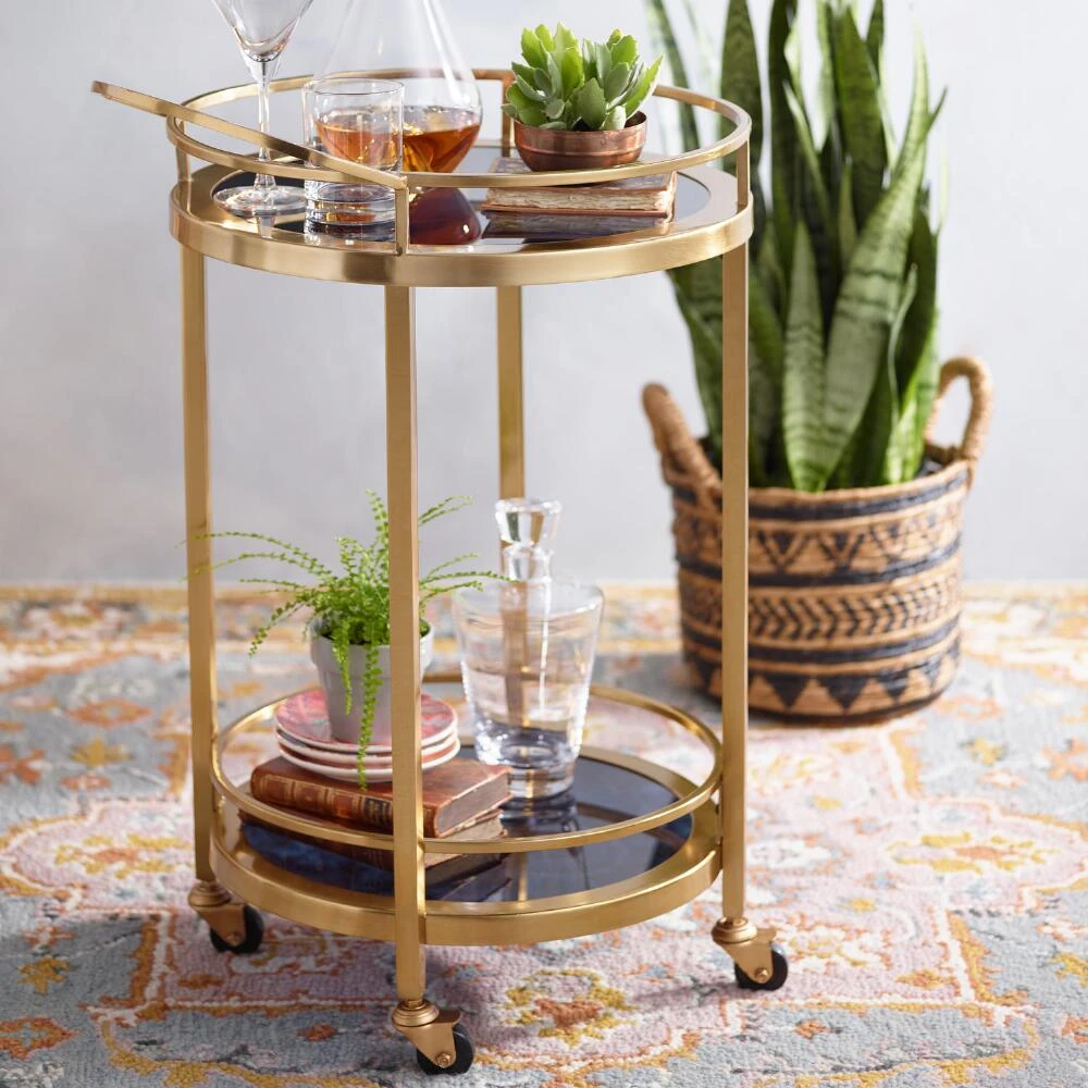Smoke-black glass shelves give our two-tier bar cart its retro-glam look. Handcrafted of steel with a luxe gold finish, it offers a bottom shelf for holding spirits and a top area for serving. A handle and caster wheels facilitate ease of mobility to keep your party on a roll.