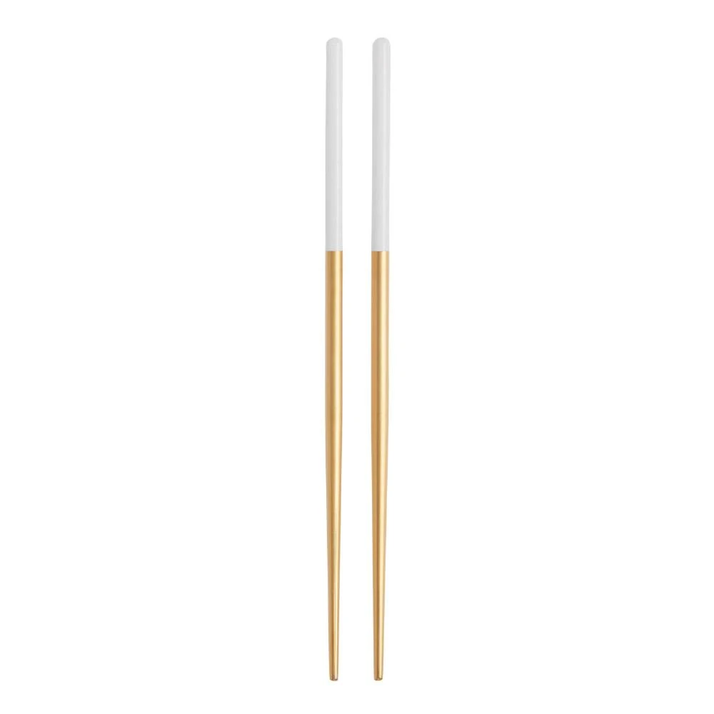 Set a sleek place setting for your table setting with our Shay chopsticks. Crafted of steel with gold-finished heads and contemporary slim white handles, they exude a polished appeal. With an upscale weighted feel in the hand, this dishwasher-safe pair defines fine dining.