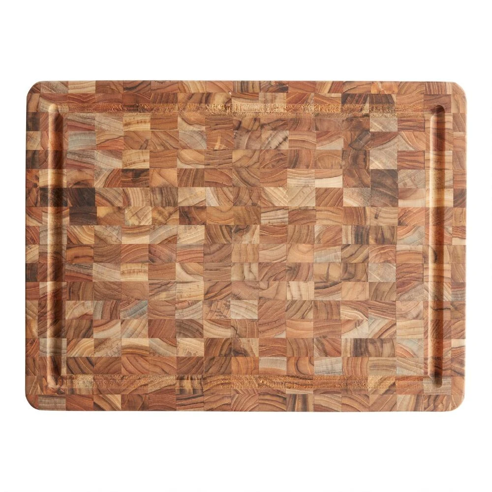 Made of end-grain teak wood sourced from a responsibly managed forest, this reversible TeakHaus BBQ butcher block is ultra-durable for use indoors and out. Displaying the unique color variations of pieced tropical teak, this thick chopping block is perfect for carving juicy oven-roasted and grilled meats. A 12×16 trencher cutting board that won’t dull knife blades, it requires only occasional oiling to preserve its distinctive beauty.