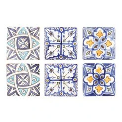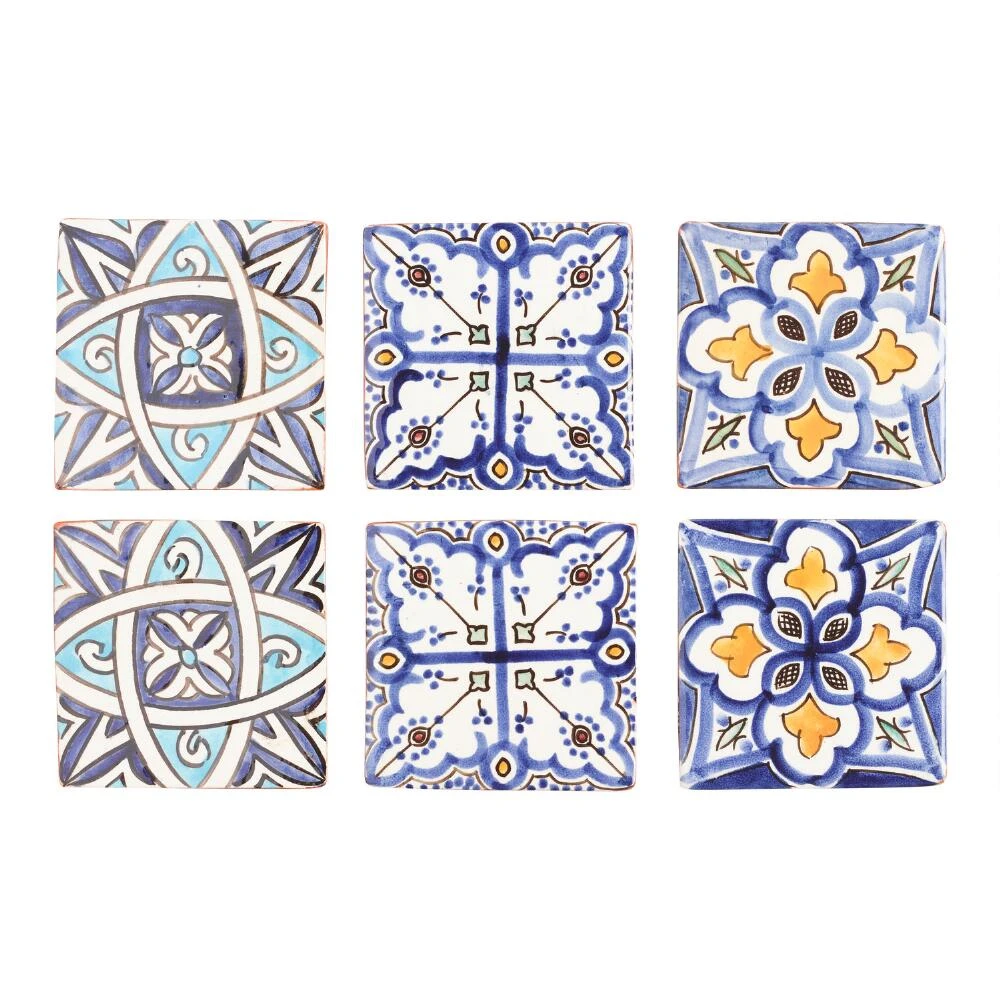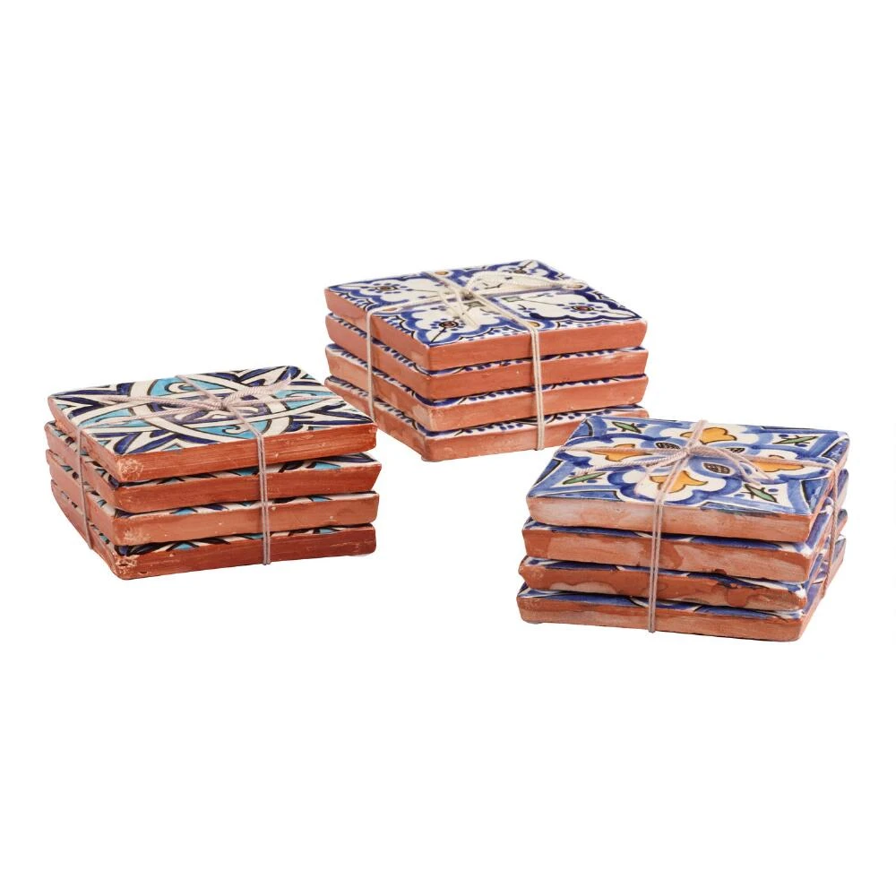 Bring a global edge to cocktail hour with our vibrant coasters made of terracotta. Each four-pack features a brilliantly colored Moroccan-inspired motif.