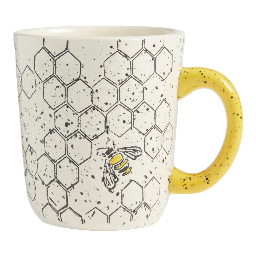 Our buzzworthy white mug with a yellow handle is artfully detailed with a bee surrounded by honeycomb and allover speckling. And just like the queen bee herself, this hand-painted mug is one of a kind. Pair with tea and honey to create a sweet, special gift for any friend or family member.