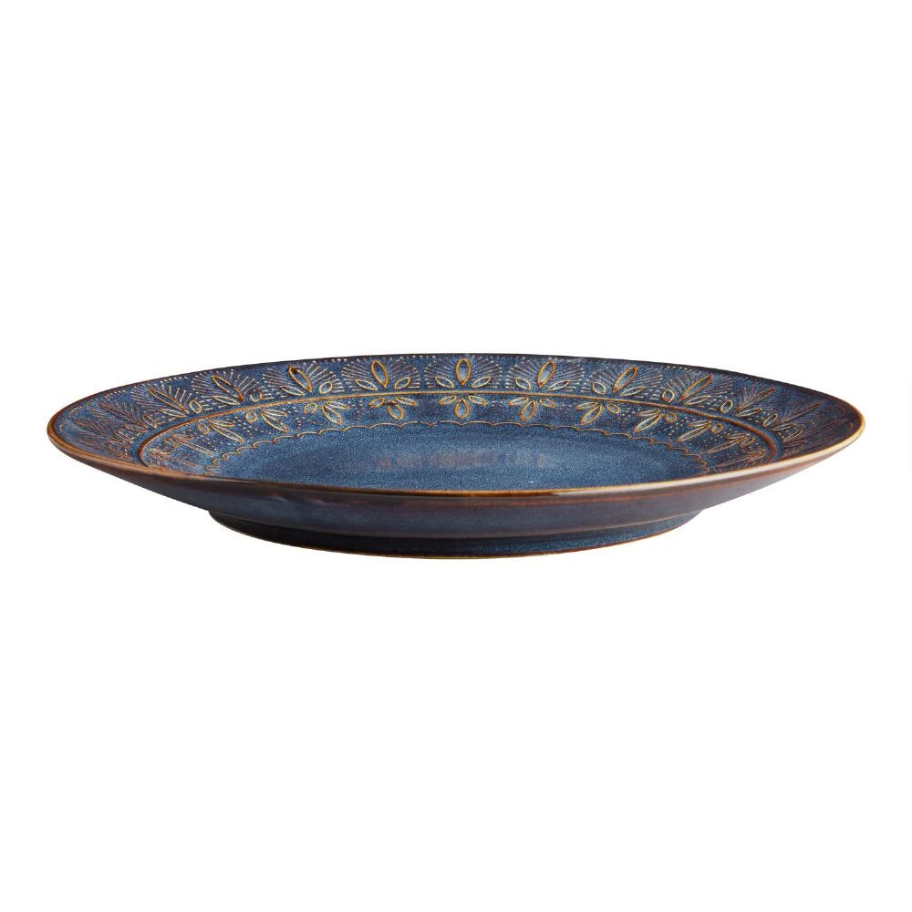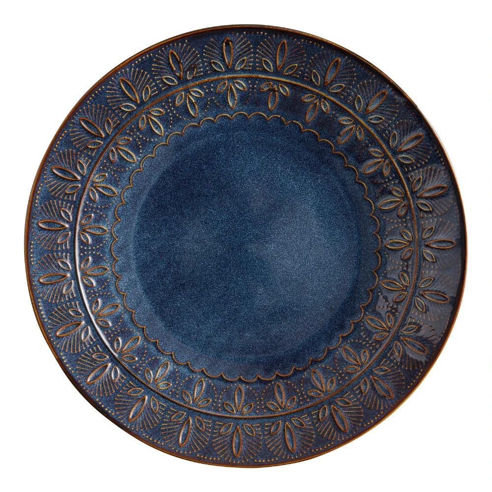 Detailed with an intricately embossed pattern around its rim, our indigo-blue Willow dinner plate gives every meal a stunning yet serene flair. The reactive glaze gives each piece dynamic texture, imbuing it with unique visual interest.