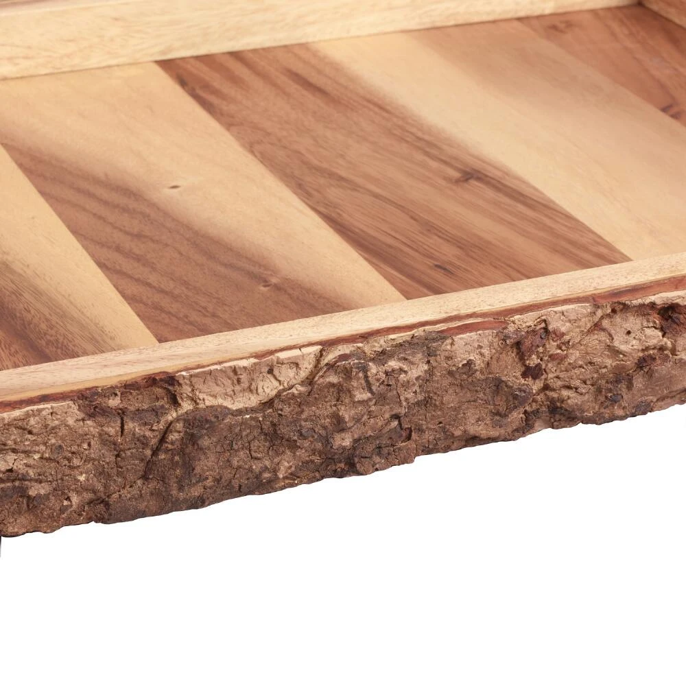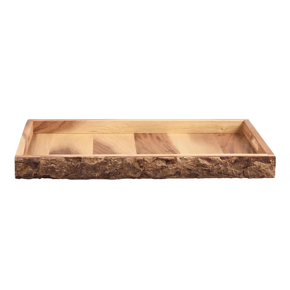 Acacia wood is naturally resistant to water, making it a smart (and beautiful) choice for serving pieces like this tray. Inherent variations in the wood’s grain render each piece unique, while exposed bark along the sides adds rustic warmth.